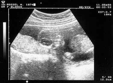 Cette échographie effectuée le 11 juin 98 (presque 4 mois) montre la tête, le haut du corps et le bras gauche. On dirait qu'il dort, couché sur le ventre, la tête nous faisant face semble posée sur un oreiller qui est en fait le placenta. On distingue le haut du corps ainsi que le bras gauche (sur la droite de l'image) qui est replié le long du corps. La main ne se trouvant pas loin de la bouche.